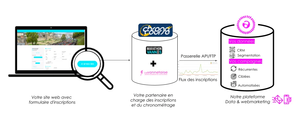 - Grâce à un flux automatisé entre votre éditeur de chronométrage et notre plateforme Webmarketing, nous remontons quotidiennement les inscriptions des coureurs ;