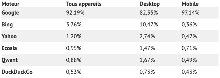 Parts de marché des moteurs de recherche en France en 2022 (Source : Webrankinfo)